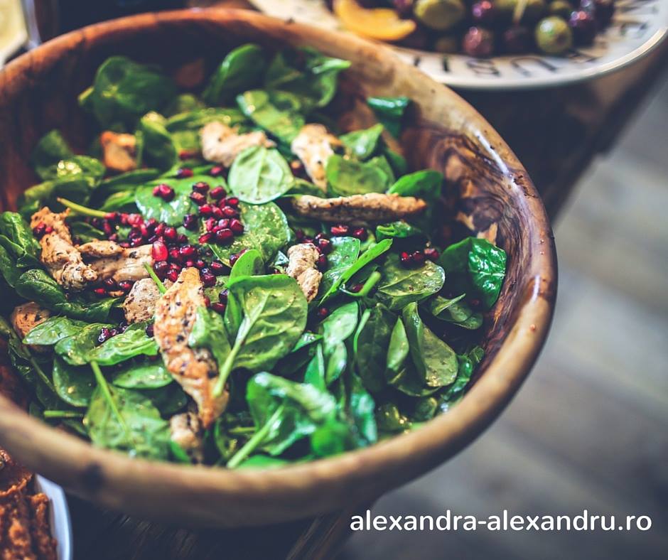Gasim retete de salate peste tot, in toate cartile de bucate, pe internet, in reviste. Incepand cu perioada Pastelui, atunci cand apar salata verde, ceapa verde, ridichile, urmate de leurda (delicioasa), untisor, loboda, spanac si cate si mai cate, pana undeva spre inceputul lunii octombrie, putem spune ca avem din belsug ingrediente proaspete autohtone. Salatele ne asigura, daca le consumam zilnic, cantitati importante de minerale, vitamine, fibre, necesare intr-o dieta echilibrata si sanatoasa. Simfonia de legume care se poate gasi intr-o salata poate constitui o masa completa de-a lungul unei zile agitate si calduroase de vara. Este de prisos sa va spun sa aveti grija la dressinguri si ca maioneza nu isi are locul in ceea ce numim noi o salata sanatoasa. Tips-uri pentru o salata gustoasa, dar si sanatoasa: folositi ulei extravirgin de masline, ulei de canepa, de in, de dovleac; macinati seminte de in, canepa, floarea-soarelui, susan pentru un plus de savoare, dar si de beneficii asupra sanatatii (semintele de canepa au acizi grasi esentiali omega 3-6, semintele de in sunt cel mai bun aliat impotriva constipatiei, iar susanul este o sursa foarte importanta de calciu); folositi din belsug verdeata precum marar, patrunjel, busuioc (vitamina C este la ea acasa in aceste verdeturi); folositi numai sare de mare sau de Hymalaia. Iata mai jos doua retete de salata de vara, foarte usor de preparat: Salata de rosii cu conopida Ingrediente: 4 rosii, un ardei gras, o ceapa rosie de apa, un catel de usturoi, o jumatate de ardei iute, cateva buchetele de conopida, ulei de masline dupa gust, sare de mare, o felie de paine integrala Mod de preparare: se taie toate legumele in feliute subtiri, se adauga usturoiul taiat foarte fin, se adauga uleiul si sare dupa gust. Se amesteca si se mananca alaturi de felia de paine integrala. Salata de castraveti cu marar Ingrediente: 5 castraveti cu tot cu coaja, marar, ceapa rosie de apa, un morcov, ulei de masline, sare de mare, otet balsamic Mod de preparare: se da morcovul prin razatoarea mare, se taie castravetii in rondele fine, se adauga mararul tocat fin, ceapa inele. Se face un dressing din uleiul de masline cu otetul balsamic si sarea si se adauga peste legume. Salata de legume coapte Ingrediente: 2 rosii, un ardei capia, o ceapa de apa, un ardei gras verde, o jumatate de vanata, o jumatate de dovlecel, un catel de usturoi. Mod de preparare: rosiile se taie in doua, vanata si dovlecelul rondele, iar restul se pastraza intregi. Se pun legumele pe o plita incinsa si se intorc cu grija pana se rumenesc. Se pun intr-un vas cu capac si se lasa cateva minute pentru a se inmuia. Se scot din vas, se taie dupa preferinte. Se face un dressing din uleiul de masline cu otetul balsamic, sarea si usturoiul taiat fin si se adauga peste legume. Pofta buna la salate!