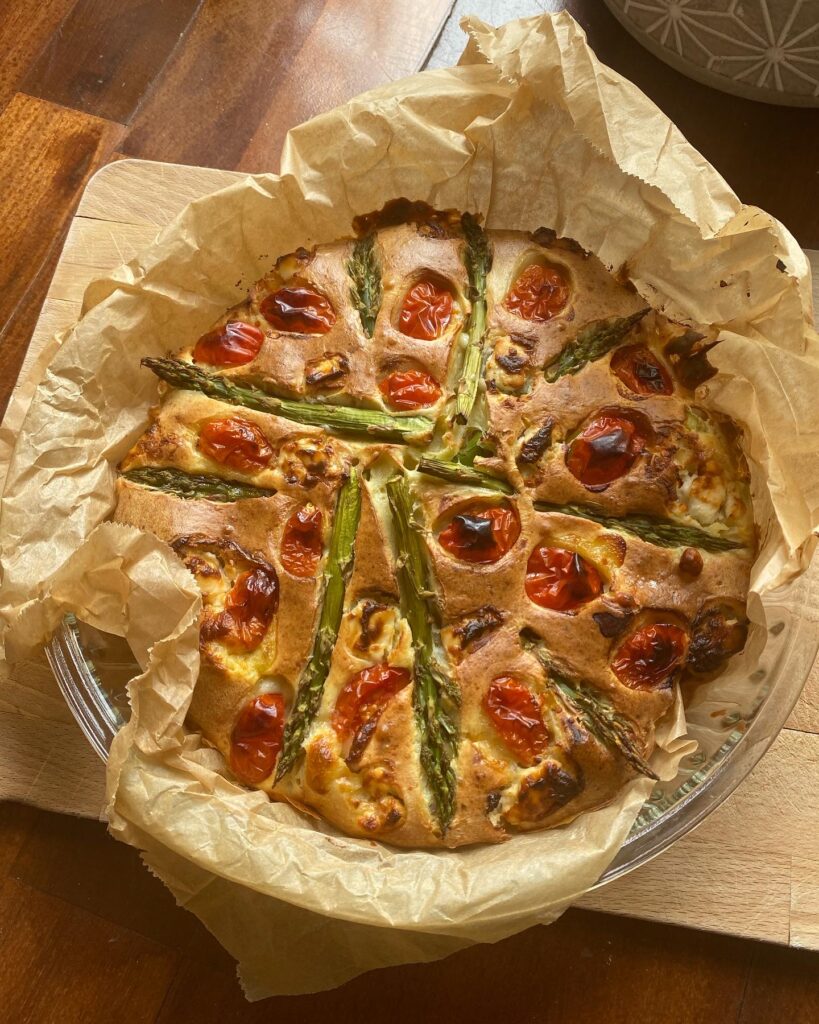 Am amestecat ouăle cu brânza Făgăraș, telemeua tăiate cubulețe mici, făina, uleiul de măsline. Apoi am presărat puțină sare. Am tăiat părțile fibroase din sparanghel, sunt prea dure să le mâncăm, iar ce a rămas din fiecare tijă am separat astfel: partea superioară, cu vârful am păstrat-o pentru final, iar restul tijei am tăiat-o în două sau trei și am amestecat totul în compoziție. Am pus toată compoziția într-un vas termorezistent pentru tartă, dar pe hârtie de copt, iar la final am adăugat tijele superioare din sparanghel, roșiile cherry și bucățele de brânză de capră rondele. Am lăsat-o cam 40 de minute la 180 de grade și am mâncat o bucată cu un bol de salate verzi.